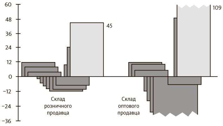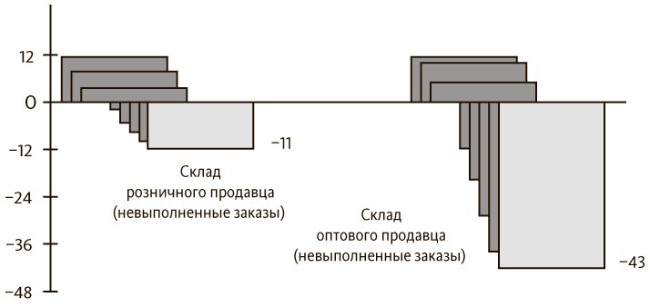 У заводов-производителей тоже есть период исполнения заказа. В вашем случае проходит две недели от момента, когда принимается решение о производстве бутылки пива, до момента, когда эта бутылка готова к отправке. Разумеется, у вас хранится определенный запас продукции на складе. Однако он был исчерпан уже на седьмой неделе, всего через две недели после того, как начали поступать увеличенные заказы. На следующей неделе у вас уже девять оптовых партий невыполненных заказов и 24 оптовые партии новых заказов, вы можете сделать доставку всего 22 оптовых партий. К этому моменту вы герой компании. Директор завода платит сотрудникам, чтобы они работали в две смены, и активно набирает новых работников.