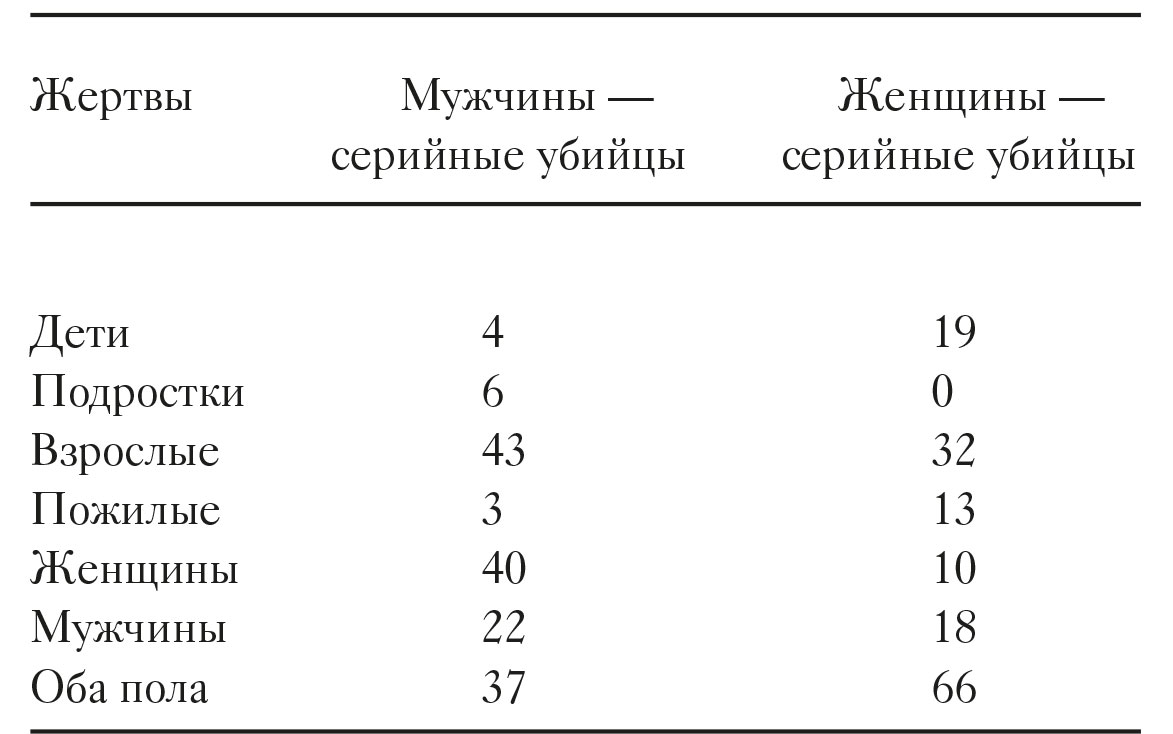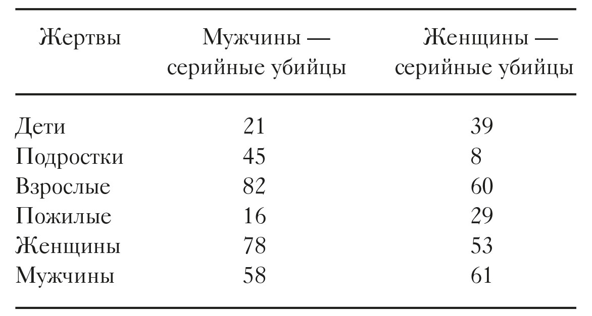 Резюмируя, мы видим, что жертвами мужчин-серийников чаще всего становятся взрослые молодые женщины, тогда как среди жертв женщин преобладают и взрослые женщины, и взрослые мужчины, с небольшим перевесом в сторону мужчин и детей. Кроме того, женщины-убийцы часто выбирают жертв среди пожилых людей, чего не скажешь о мужчинах, планирующих убийство.