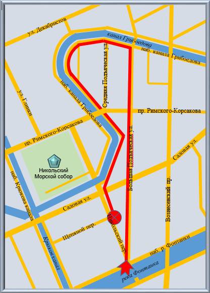 Ну что ж, двинемся в путь по Большой Подьяческой, сопровождаемые великолепным видом купола Исаакиевского собора, открывающимся в створе улицы.