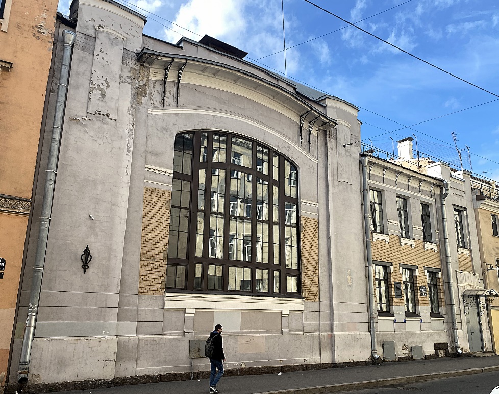 Это бывший доходный дом братьев Марголиных, построенный в 1914 году по проекту Александра Львовича Лишневского – одного из лучших петербургских архитекторов начала XX века. Лишневский работал сначала в стиле модерн, а в начале 1910-х годов построил и несколько зданий в духе неоклассики, в том числе и этот добротный дом с благородными фасадами. Глубокие лоджии верхних этажей создают образ ренессансного дворца. В декоре использованы, как всегда у Лишневского, довольно странные образы. Так, например, в сандриках окон четвертого этажа помещена разверстая пасть какого-то мифического зверя, «вырастающего» из морской раковины.