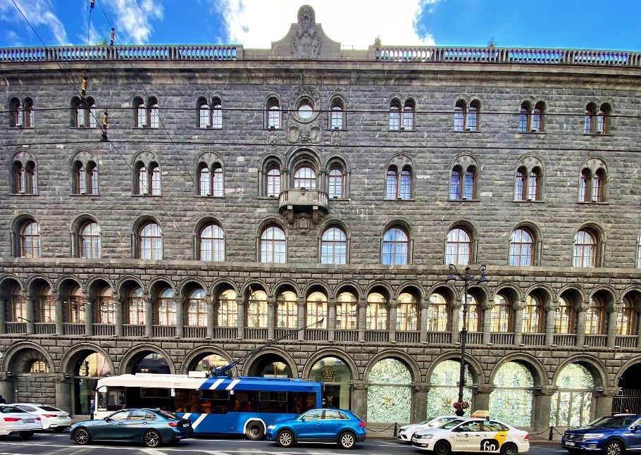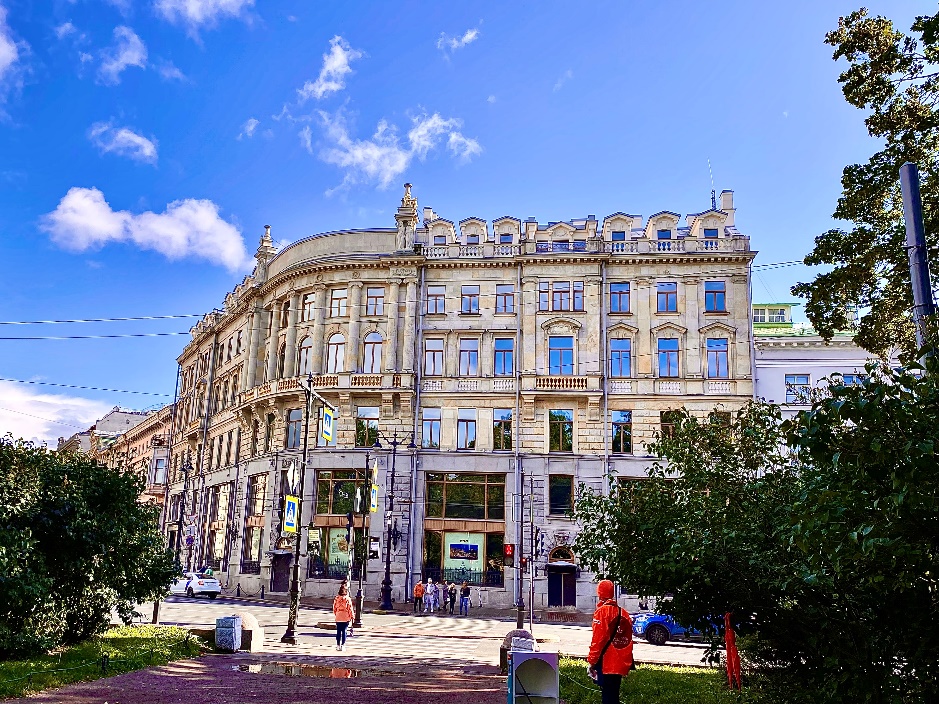 Пройдём по дорожке Александровского сада в сторону Дворцовой площади и остановимся в створе Невского проспекта. Угловое здание справа, дом 1, целиком облицованное светло-серым гранитом и желтоватым радомским песчаником, с колоннадой в уровне четвёртого и пятого этажей, а также кариатидами и канделябрами на парапете, построено в 1911 году по проекту архитектора Владимира Петровича Цейдлера.