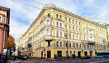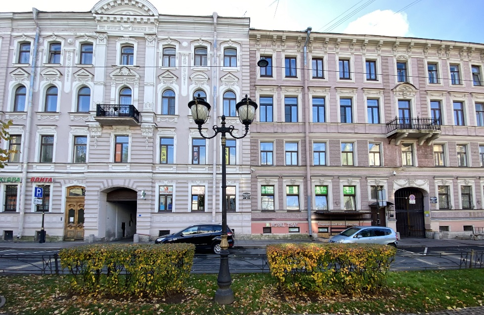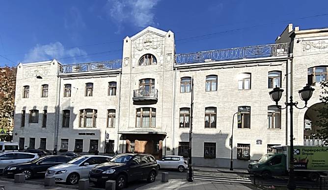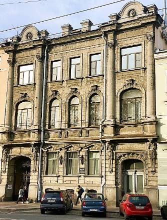 Остановимся напротив дома 20, фасад которого украшают плетёные бордюры, стилизованные орлы, растительные орнаменты. Это здание, построенное в 1875-1877 году по проекту архитектора Ивана Семёновича Богомолова, стало первым в Петербурге, созданным в русском, или правильнее сказать в неорусском стиле. О его архитектуре одобрительно отзывался известный искусствовед Владимир Васильевич Стасов. В 1883 году архитектор В. Кене надстроил пятый этаж, и дом приобрёл существующий поныне облик.