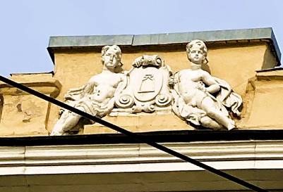 Фасад в стиле эклектики, украшенный скульптурными композициями и лепным декором, сохранился без потерь. В том числе и загадочный предмет, помещенный на фронтоне в месте, традиционно отводимом для вензеля владельца.