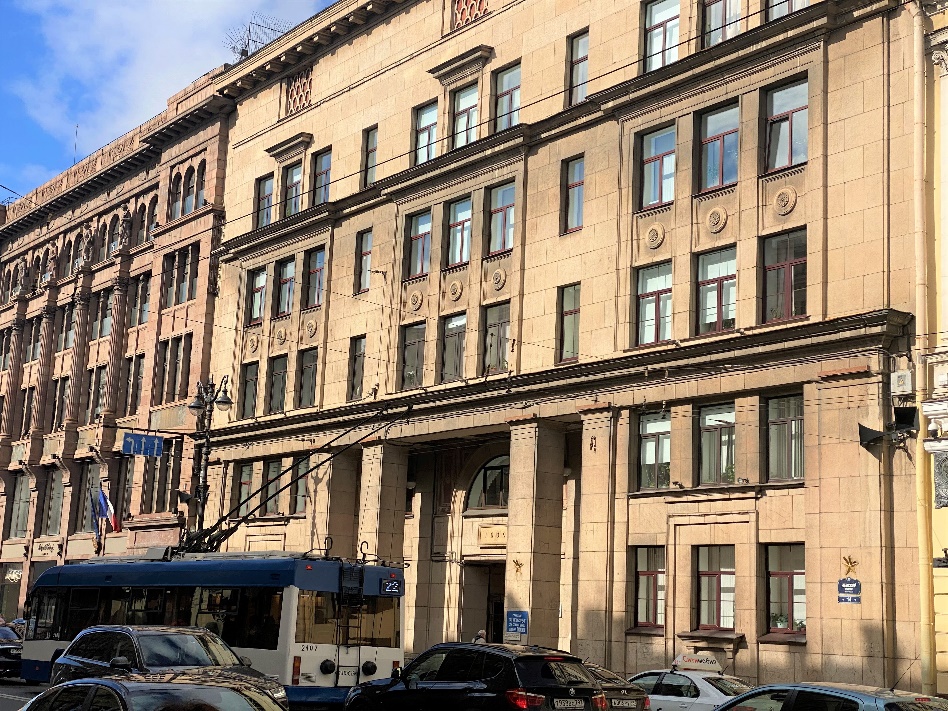 Главный фасад здания смотрит на Михайловскую улицу, проложенную по замыслу великого зодчего Карла Ивановича Росси в 1819-1825 годах исключительно для того, чтобы открыть перспективу со стороны Невского на Михайловский дворец. Дома на улице были оформлены пилястровыми портиками и составляли продолжение ансамбля Михайловской площади.