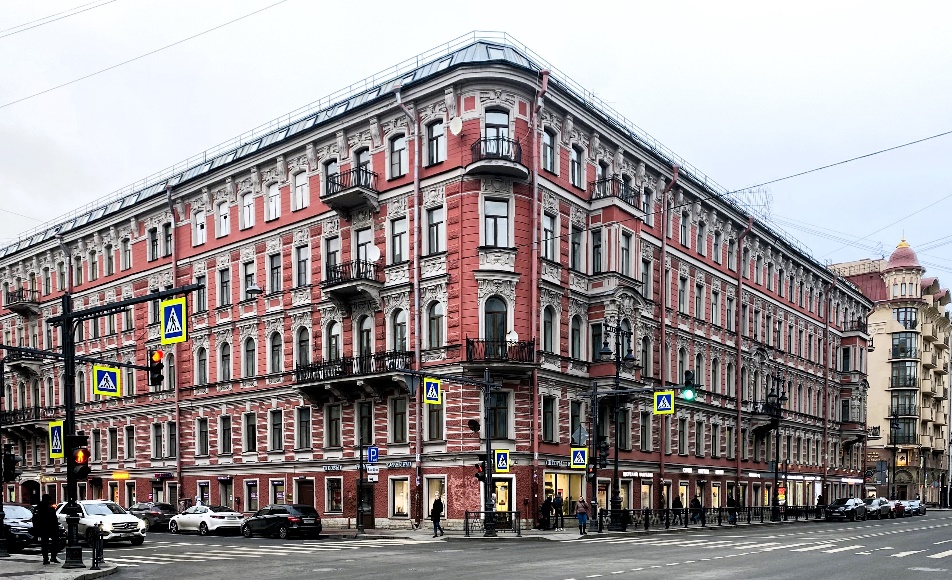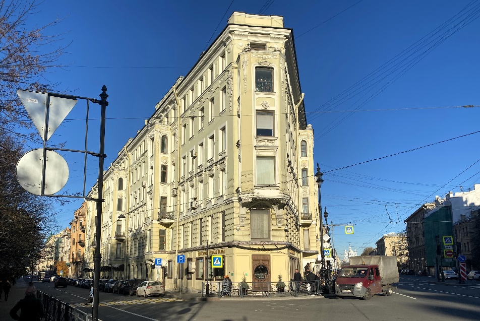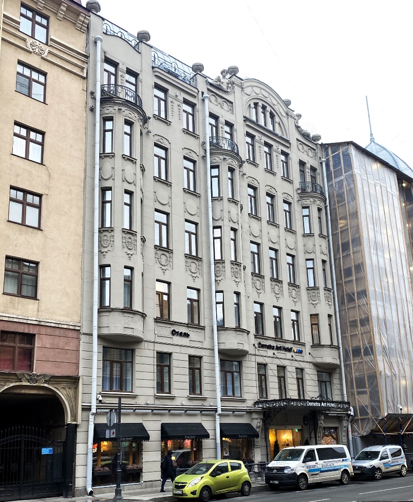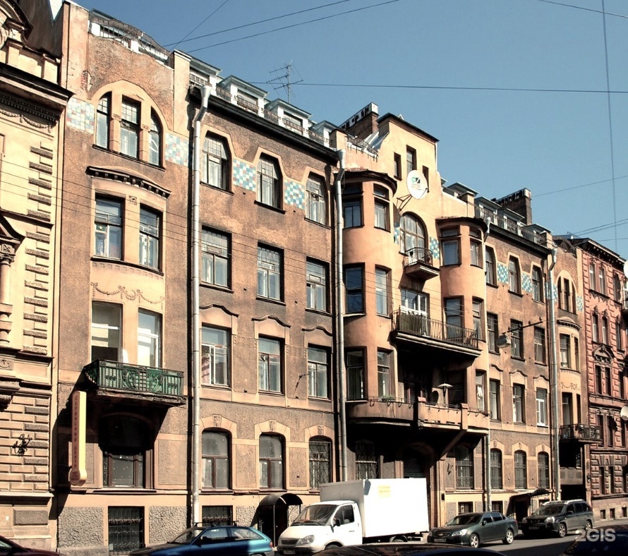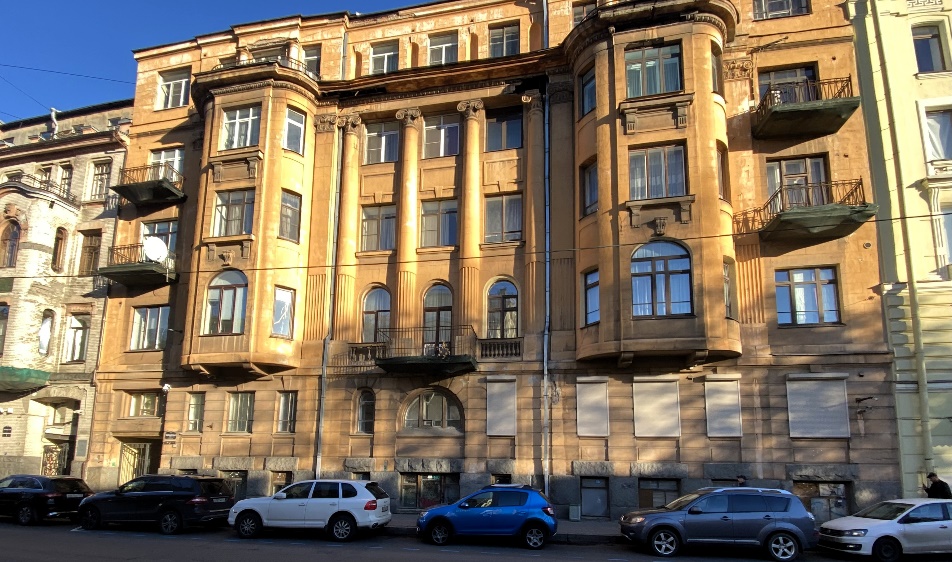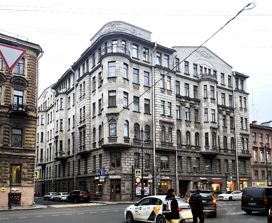 А вот дом 44 принадлежит к переходному стилю от модерна к неоклассике. Его возвел в 1913-1914 годах архитектор Вильгельм Иванович Ван-дер-Гюхт, создавший в Петербурге небольшое количество выразительных, запоминающихся зданий, которые и в наши дни служат важными градостроительными акцентами. В этом проекте зодчий расположил главный вход не по оси здания, а сместил его в правую часть, подчеркнув асимметричность высоким криволинейным фронтоном, украшенным ионическими капителями, вазами и скульптурными фигурами юноши и девушки.