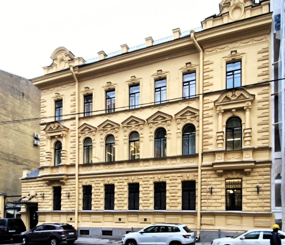 Дом 40 по улице Восстания не уступает дому 36 по размерам, но эклектичная отделка его фасадов сохранилась несопоставимо лучше. Это здание было построено в том же 1880 году по проекту архитектора Петра Ивановича Шестова.