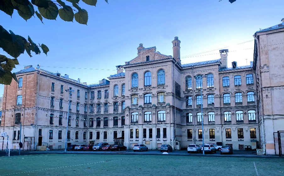 Свернём налево и, пройдя по Суворовскому проспекту без малого 400 метров, окажемся перед металлическим ограждением, за которым, в глубине сквера, находится здание, построенное в 1900-1901 годах специально для Николаевской академии Генерального штаба (Суворовский, 32А). «Милостью Государя» для академического комплекса был отведен участок на Преображенском плацу, который с середины XIX века начал постепенно застраиваться (изначально плац находился в границах современных улиц Кирочной, Таврической, Парадной, Виленского переулка и Суворовского проспекта).