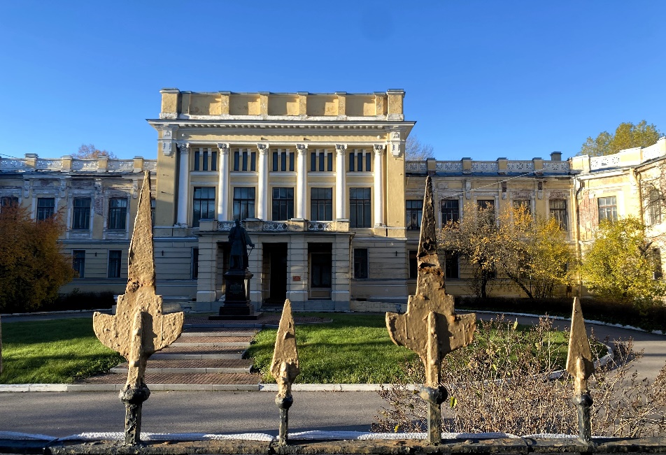 П-образный корпус с колонным портиком напоминает старинные усадебные дома. Высокий парапет, по углам которого некогда восседали огромные орлы, украшали лепные изображения военной арматуры.