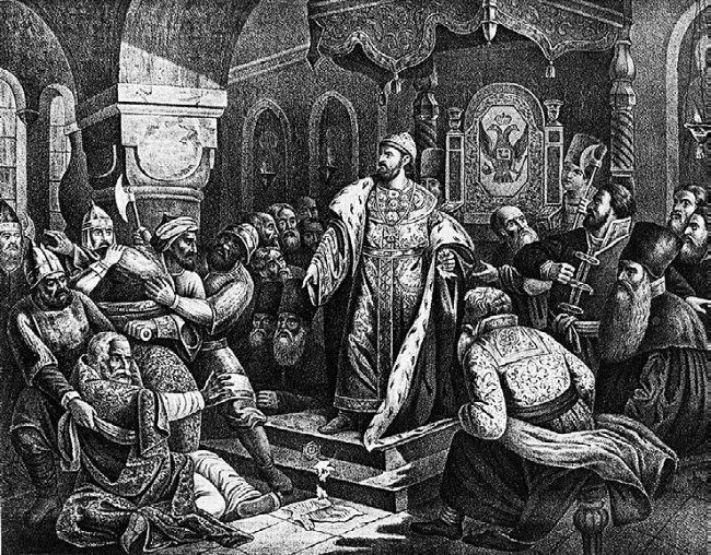 Семейные и придворные дела. Необыкновенно быстрые успехи великого князя Ивана III в собирании русских земель сопровождались существенными переменами в московском придворном быту. Первая жена Ивана III, тверская княжна Мария Борисовна, умерла рано, в 1467 г., когда Ивану не было еще и 30 лет. После нее у Ивана остался сын – князь Иван Иванович «Молодой», как его обыкновенно называли. В ту пору уже завязывались сношения Москвы с западными странами. По разным причинам римский папа был заинтересован тем, чтобы установить сношения с Москвой и подчинить ее своему влиянию. От папы и вышло предположение устроить брак молодого московского князя с племянницей последнего константинопольского императора Зоей-Софией Палеолог. После взятия Царьграда турками (1453) брат убитого императора Константина Палеолога, по имени Фома, бежал с семейством в Италию и там умер, оставив детей на попечение папы. Дети были воспитаны в духе Флорентийской унии, и папа имел основания надеяться, что, выдав Софью за московского князя, он получит возможность ввести унию в Москву. Иван III согласился начать сватовство и отправил в Италию послов за невестой. В 1472 г. она приехала в Москву и брак состоялся. Однако надеждам папы не было суждено осуществиться: папский легат, сопровождавший Софью, не имел никакого успеха в Москве; сама Софья ничем не содействовала торжеству унии, и, таким образом, брак московского князя не повлек за собой никаких видимых последствий для Европы и католичества[3]. Но он имел некоторые последствия для московского двора.