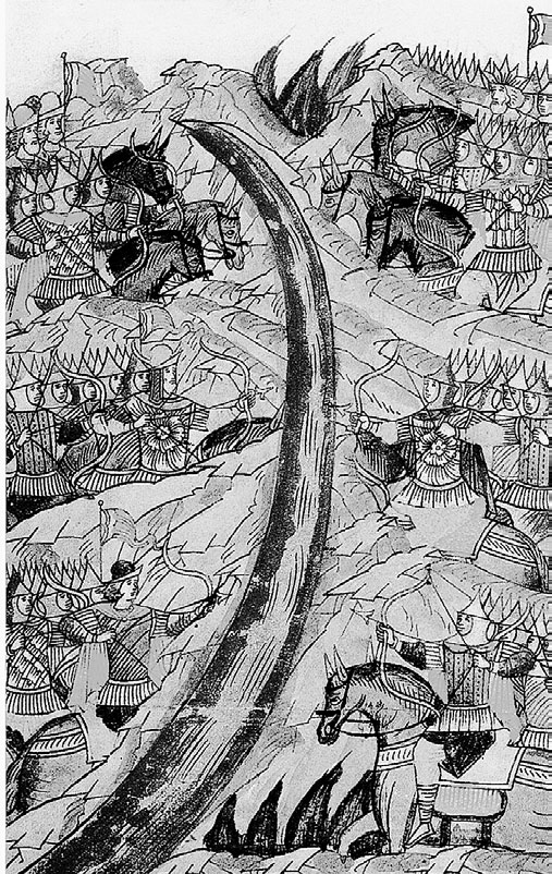 Сражение на реке Угре, положившее конец ордынскому игу. Миниатюра из Лицевого летописного свода. XVI в.