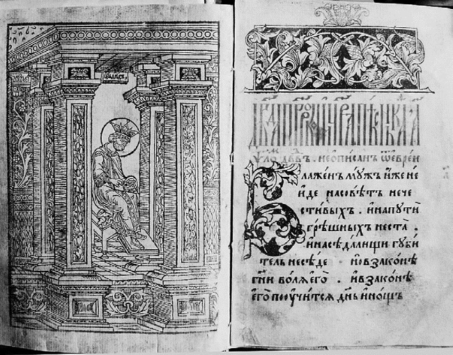 Фронтиспис первопечатной Псалтири с изображением царя Давида работы Андроника Невежи. 1568 г.