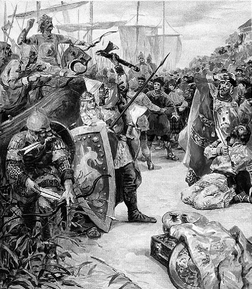Но объединением славян Олег не ограничился. По примеру своих киевских предшественников Аскольда и Дира, сделавших набег на Византию, Олег задумал поход на греков. С большим войском «на конях и на кораблях» подошел он к Константинополю (907), опустошил его окрестности и осадил город. Греки завели переговоры, дали Олегу «дань», т. е. откупились от разорения, и заключили с Русью договор, вторично подтвержденный в 912 г. Удача Олега произвела глубокое впечатление на Русь: Олега воспевали в песнях и его подвиги изукрасили сказочными чертами. Из песен летописец занес в свою летопись рассказ о том, как Олег поставил свои суда на колеса и по суху на парусах «через поля» пошел к Царюграду. Из песни же, конечно, взята в летопись подробность о том, что Олег, «показуя победу», повесил свой щит в вратах Царяграда. Олегу дали прозвание «вещего» (мудрого, знающего то, что другим не дано знать). Деятельность Олега в самом деле имела исключительное значение: он создал из разобщенных городов и племен большое государство, вывел славян из подчинения хазарам и устроил, путем договоров, правильные торговые сношения Руси с Византией; словом, он был создателем русско-славянской независимости и силы.
