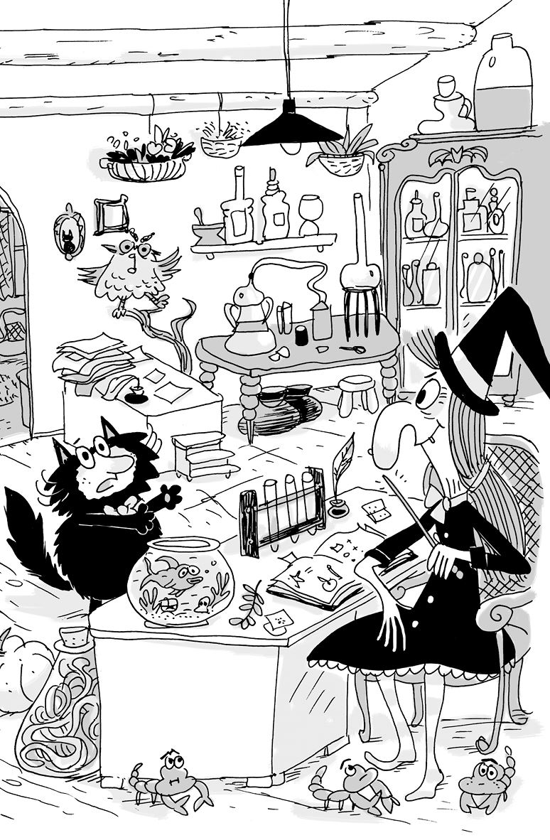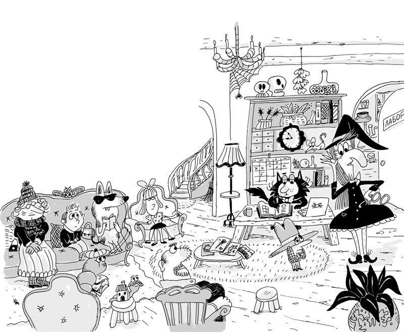 Гостиная Молли была превращена в комнату ожидания. Юная колдунья принимала пациентов у себя в лаборатории среди настоек, баночек, котелков, перегонных аппаратов и волшебных порошков. В углу было место Месье Филина, который, держа перо в клюве, вёл записи, выписывал рецепты и выдавал порошки и сиропы, изготовленные тремя скорпионами – ассистентами Молли.