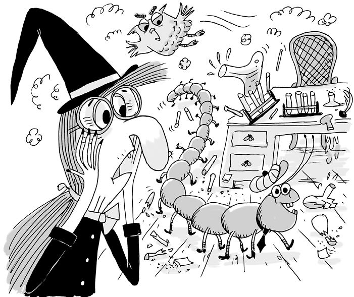 Танцуя, сороконожка опрокинула сотню сосудов, и ещё в десять раз больше взлетело в воздух пакетиков с порошками и пузырьков с микстурами. Это было похоже на порывы бури в лавке торговца почтовыми марками. Когда Молли наконец удалось выставить сороконожку за дверь, кабинет походил на коробку с рассыпавшимися пазлами: кругом разбросанные как попало мелкие кусочки.