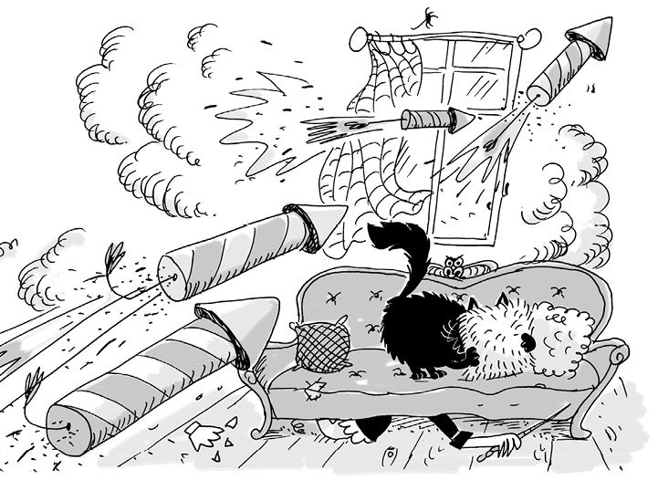 Паф, пуф, пиф! Но тут, кажется, всё пошло не так, как планировала Молли. Все четыре оставшиеся ракеты взлетели одновременно. Комната наполнилась пламенем и дымом. Чтобы не поджариться, как сосиски на гриле, все попрятались, кто куда мог.