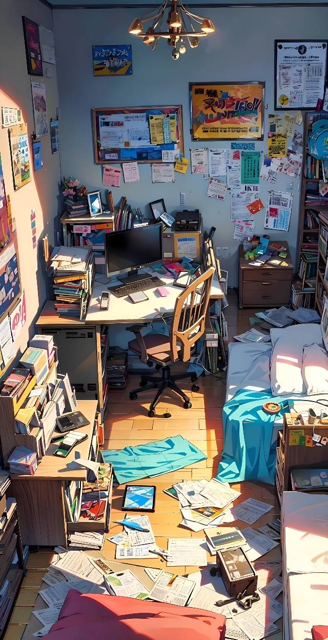Напротив дивана игровой стол с включённым компьютером и незакрытой игрой. На столе дикий беспорядок, свободное место только для коврика с мышью. Кругом разбросаны мятые салфетки, упаковка из-под чипсов и недопитая бутылка Кока-Колы. Над монитором на полке аккуратно стоят фигурки из аниме “Клинок, рассекающий демонов”.