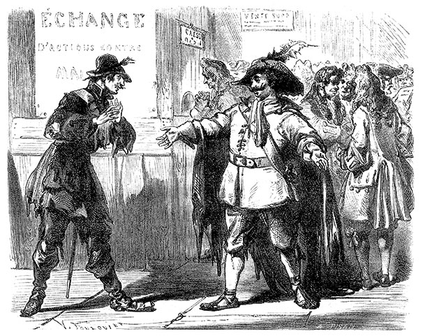 Часов около девяти, когда сутолока немножко уменьшилась, поскольку даже у спекуляторов возникает обременительная потребность подкрепиться, в ворота вошли с небольшим интервалом два человека, мало похожие на финансистов. Хотя вход был свободный, оба визитера, судя по их виду, были не вполне уверены, имеют ли они на это право. Первый весьма неловко скрывал неуверенность под нарочитой бесцеремонностью; второй же, напротив, старался держаться как можно смиренней. У обоих на боку болтались шпаги такой длины, что уже за три лье чувствовалось, что люди эти – драчуны и забияки.