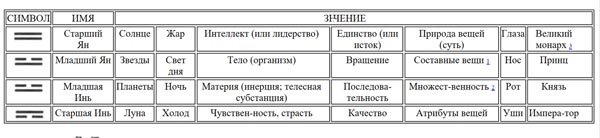 «Система И» изображает все комбинации существования. Ее элементы – Ян (позитивный принцип) и Инь (негативный принцип) – стоят за всеми явлениями бытия. Ян означает "светлый"; Инь – "темный". Ян является принципом небес; Инь – принципом земли. Ян – это солнце, Инь – луна. Ян – мужское и активное качество; Инь – женское и пассивное качество. Первое – движение, второе – покой. Ян – сильный, твердый, величавый; Инь – мягкий, гибкий, покорный, женоподобный. Взаимные столкновения и различные связи этих двух элементарных контрастов обуславливают все разнообразие и природу вещей, характер и судьбы людей.