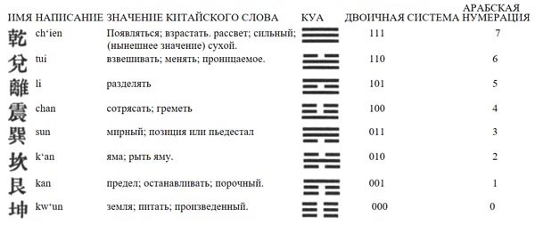 Эта «И из Чжоу» (наш нынешний И-Цзин) показывает два варианта расположения фигур куа, первый из которых приписывается их автору, легендарному Фу Си[6], а второй – Вэнь-вану[7]. Фу Си, так же известный как Фенг[8] («ветер») и Таи Хо[9] («великий небожитель»), жил, согласно китайским архивам, в период времени с 2852 по 2738 гг. до н. э. Можно лишь изумляться математическим талантам древних основателей китайской цивилизации, поскольку первоначальный порядок Йи, приписываемый Фу Си, почти соответствует двоичной арифметической системе Лейбница. Если мы изобразим Инь, как 0, а Ян, как 1, то окажется, что восемь триграмм обозначают цифры 0-7, последовательно расположенные снизу вверх. Лейбниц знал о «системе И» и высоко ценил ее. Возможно, именно она навеяла ему идею о двоичной системе.