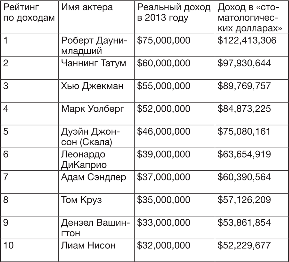 Теперь представьте, что Роберт Дауни-младший, который по мнению Forbes, был самым высокооплачиваемым актером в мире в 2012/13 годах, является топовым стоматологом и ему платят такую же долю от общих доходов среди стоматологов, какую он получает, будучи актером. Вместо его 75 миллионов долларов в год, он бы зарабатывал почти на 50 миллионов долларов больше, то есть примерно 122 миллиона в год. Группа из 10 самых высокооплачиваемых актеров, ставших стоматологами, забирала бы домой три четверти миллиарда долларов в год.