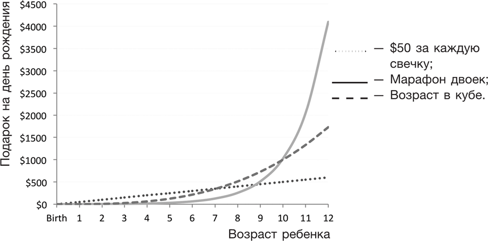 Проведите следующий мысленный эксперимент, чтобы понять мощь экспоненциального роста. Если бы вы могли получать денежный подарок, который бы увеличивался с каждым годом, за каждый день рождения ваших детей, и поместить эти деньги в трастовый фонд, пока им не исполнится 21, какой из этих вариантов вы бы выбрали?
