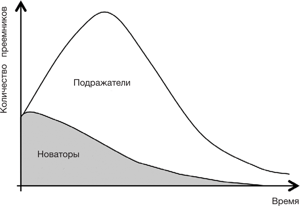 Его идея, известная как модель инновации Басса, основана на математических расчетах. Модель Басса выделяет ряд людей, которых он называет «новаторами» (как знатоки у Гладуэлла и ранние последователи Роджерса), не тех, кто производит новый продукт, а тех, кто первым пробует новые продукты и услуги, – и именно отсюда продукт подхватывается широкими массами с помощью «подражателей».