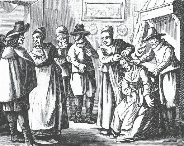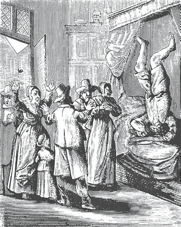 Внимательно ознакомившись с описаниями припадков, можно сделать вывод о том, что сведение членов у бесноватых могло достигать необычайной степени. Посмотрите на эту старинную картинку на ней изображен несчастный, стоящий на голове вверх ногами, который вызывает изумление у всех присутствующих. Других сводило в виде дуги: они опирались лишь на затылок и на пятки, затем ими овладевали конвульсии, во время которых их подбрасывало вверх. Завершался припадок бредом и рвотой.