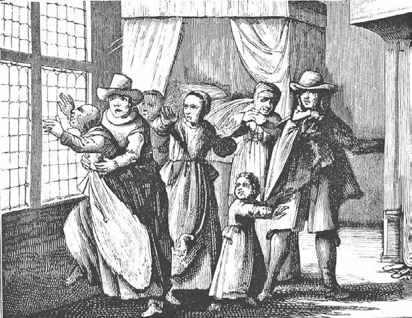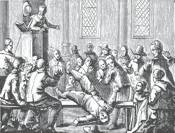 Особенно часто подобные припадки беснования случались во время проповедей и церковных обрядов. Привожу еще одну гравюру, заимствованную у Палинга, на которой изображен припадок, начавшийся в самой церкви, в то самое время как проповедник трактует о власти демона.