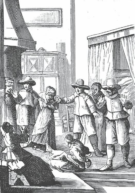 Описание таких припадков у колдуний завело бы нас слишком далеко. А потому я заимствую из трактата о демонизме, напечатанного в 1659 году в Амстердаме Абрамом Палингом, несколько гравюр, которые познакомят читателя с их различными моментами. Например, во время обеда колдунья вдруг падала на пол со страшным криком. Она билась в судорогах, ее лицо утрачивало человеческий облик, и сам дьявол сводил ее черты. Посмотрите, какой испуг написан на лицах всех приглашенных. Все ее тело вздрагивало, она оглашала воздух воплями, изо рта у нее шла пена. Наконец, дьявол покидал ее, причем его выход из тела бесноватой сопровождался страшными приступами рвоты.