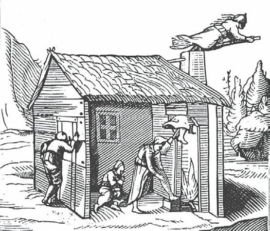 Взгляните на гравюру XVIII века – на ней изображена колдунья, намазывающая тело, в то время как другая уже вылетает из трубы верхом на палке. Иногда колдунья просто призывала своего демона, тот сажал ее себе на плечи и летел с ней. Нечто подобное изображено на гравюре заимствованной нами из «Богословского Трактата», написанного в XVI веке преподобным отцом Гуачиусом.
