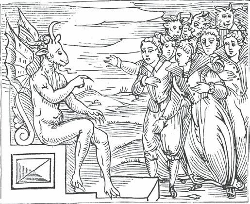 Во время пути колдуньи защищали себя от дождя какими-нибудь магическими словами. Посетители шабаша подвергались предвари тельному осмотру, они должны были доказать, что носят на теле печать Сатаны. Затем, оказавшись на шабаше, надлежало совершить поклонение Сатане, как председателю собрания. Он сидел на троне, не переряженный и не переодетый, причем голова и ноги у него были козлиные (старинное предание о боге Пане). Кроме того, его украшал громадный хвост и крылья, как у летучей мыши. Впрочем, иногда он принимал и другой облик (ведь галлюцинации у всех колдуний не могли совпадать), и тогда он являлся в виде осла, большого кипариса, черного кота и т. д.