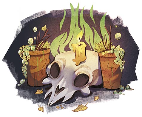 И тут я увидела, что нахожусь в самом настоящем доме! Правда, всё здесь было не по-людски. На старом пеньке, который располагался посреди комнаты в качестве стола, стоял жуткий череп неизвестного животного, от него исходил очень странный мертвенно-зеленоватый свет. Большое зеркало в раме из чёрных рогов было таким мутным, что в нём очень сложно было что-то разглядеть, – сплошной серый туман. Вместо дивана на полу лежала куча сухой травы. От её запаха кружилась голова.