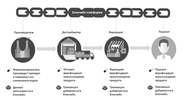 В сфере цепочек поставок фармацевтической продукции технология блокчейн может иметь несколько вариантов использования. Одним из них является обеспечение безопасной цепочки поставок и отслеживание (Track&Trace) для противодействия росту контрафактной фармпродукции и связанных с ней затрат. Другой вариант использования – это оптимизация цепочки поставок, которая обеспечивает эффективность, сокращение расходов и возможность контроля уровня запасов, а также скорость и точность кампаний по отзыву препарата из обращения21. Кроме того, применение блокчейна может качественно улучшить мониторинг холодовой цепи, прослеживаемость происхождения и движения фармацевтических субстанций/АФИ (активных фармацевтических ингредиентов) до конечного продукта.