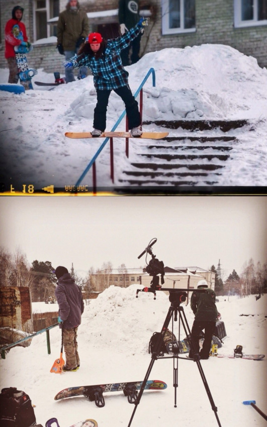 А дело было так. Я приехала из той первой поездки в Геш, и почти сразу пришла в Бобровый лог. Там стояли рейлы, и я уже была готова к тому, чтобы учиться по-нормальному джибить. В Бобровом всегда была флэйва. Тогда, в феврале 2011 года, это были: Кузин, Антон, Рэпчик, Герасименко и несколько человек, которые иногда приходили и уходили.