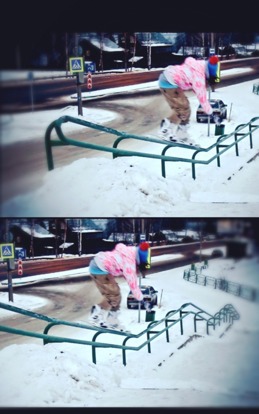 …Вот я приезжаю в Дивный, уже на следующий год после той катки на школе. Ищу по карте адрес, прихожу на спот. Это жесткий косой кинк, в сильный наклон, с поворотом и сложным переходом. Разгона нет, поэтому на подъезде к нему пацаны сделали несколько снежных бугров, чтобы набрать хоть немного скорости. Запрыгивать на него нужно было практически вообще без ходов.
