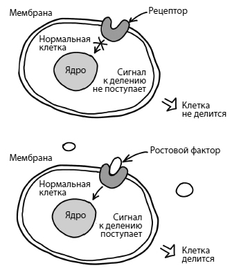 В норме деление клеток в нашем организме – это очень сложная, жестко запрограммированная система. Клетки не делятся просто так, когда им заблагорассудится, все происходит только после получения сигнала извне (см. рис. 1). Обычно этим сигналом служат так называемые ростовые факторы – специальные молекулы, которые поступают к клеткам из крови и межклеточного пространства. Эти молекулы могут, например, прикрепляться к рецепторам (это специальные белки на поверхности клеток, которые могут воспринимать сигналы извне), тем самым запуская каскад реакций внутри клеток.