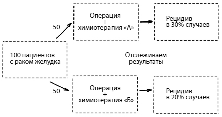Для того чтобы понять, какой подход действительно будет лучше, нам нужно провести исследование, которое может выглядеть так: мы берем 100 пациентов с раком желудка, случайным образом делим их на две группы, и одна группа пациентов после операции получает несколько курсов химиотерапии «А», а пациентам из второй группы просто выполняют операцию без химиотерапии. После этого пациентов из обеих групп отслеживают в течение некоторого времени, чтобы посмотреть, в какой группе результаты лечения будут лучше.
