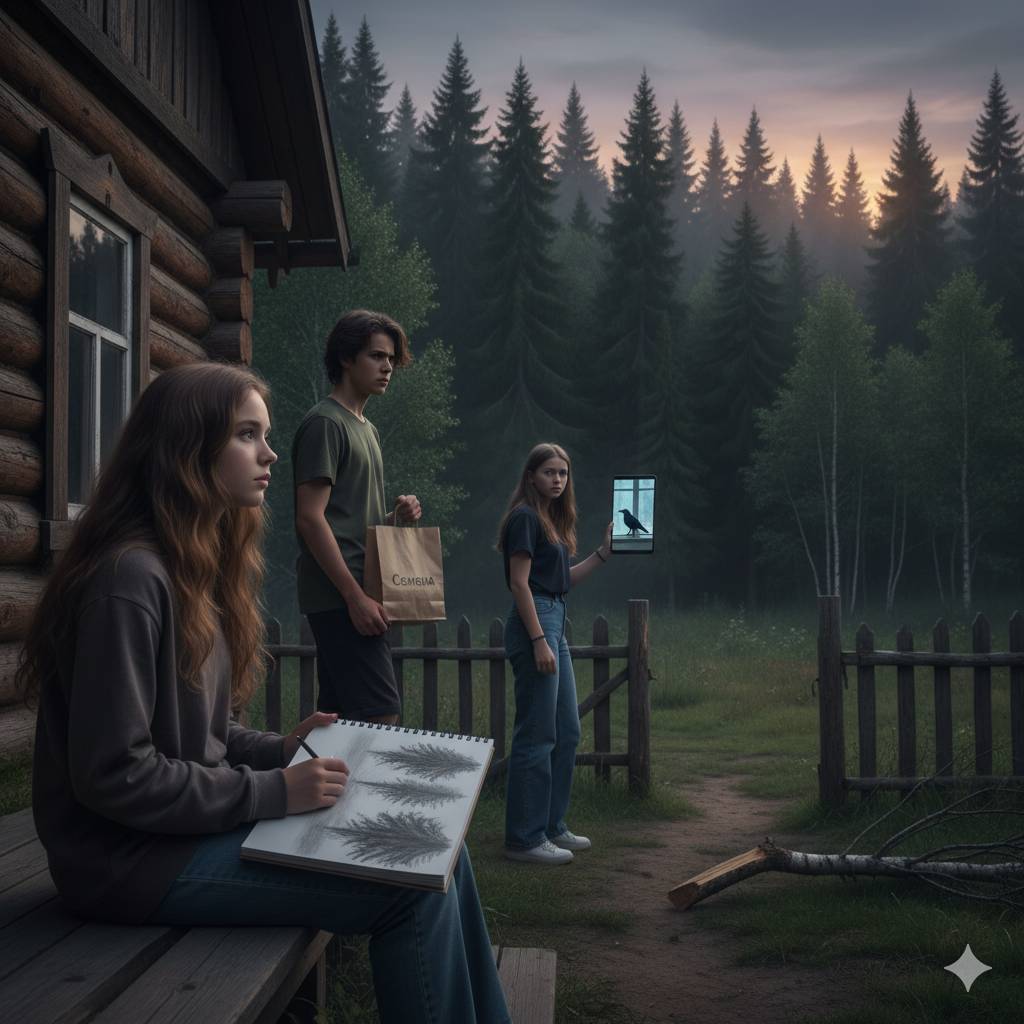 На крыльце сидела шестнадцатилетняя Мила. В руках она держала блокнот и карандаш, давила грифелем так сильно, что оставались вмятины на нескольких листах. На бумаге раз за разом получались одни и те же силуэты: высокие ели, наклонённые к краю листа, будто тянул их какой-то невидимый ветер. Девушка стирала, начинала заново – и вновь деревья уходили из деревни. Как будто блокнот сам настаивал: «смотри, лес тянется прочь».
