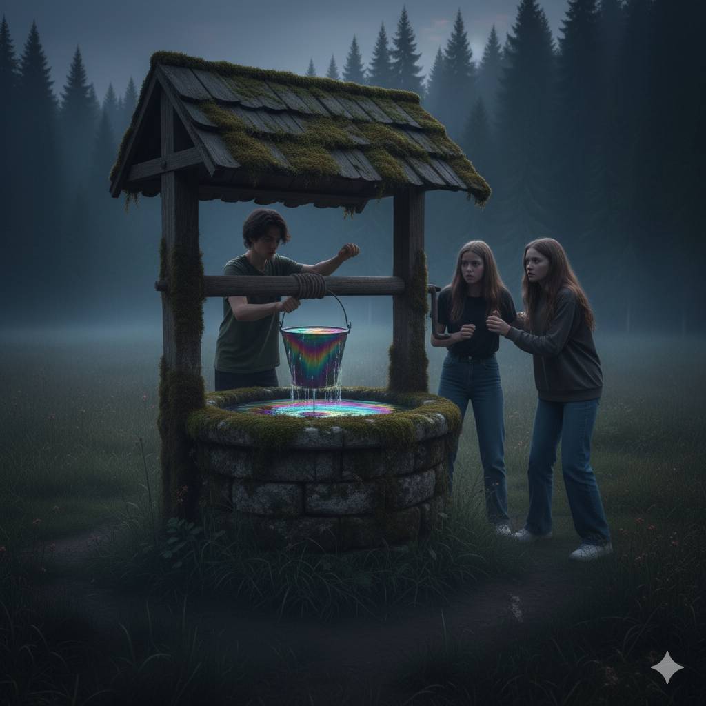 Илья привычно взялся за ворот. Цепь звякнула, ведро ушло вниз. Мила и Соня встали рядом, заглядывая в тёмную глубину. Но когда ведро поднялось, на поверхности вода играла неприятной радужной пленкой, словно на бензиновой луже. В детстве они любили такие переливы – «волшебство», говорили. Теперь полоски бензиновых цветов пахли металлическим привкусом.
