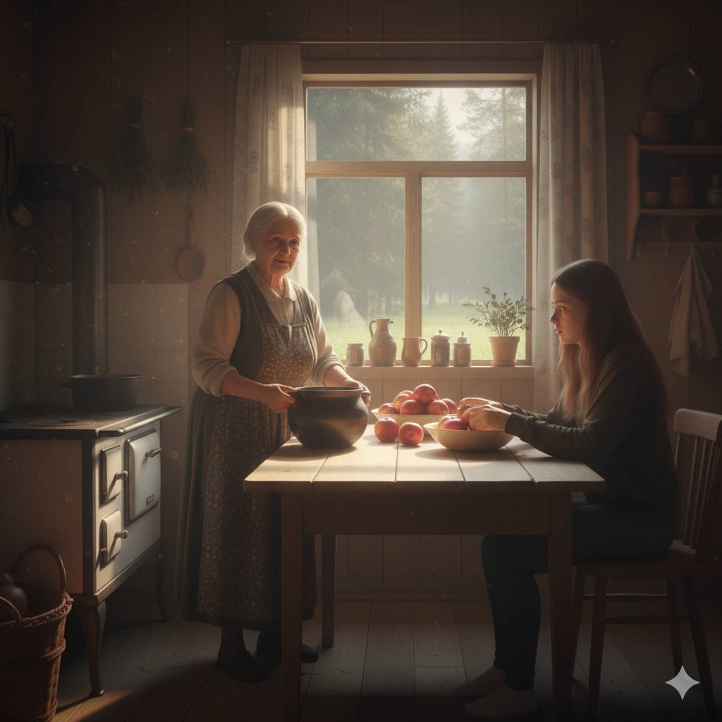 Они вернулись домой почти в молчании. В кухне пахло печёными яблоками. Бабушка сидела у стола, перебирая сушёные травы. Старый белёный кирпич печки тёпло дышал в спину.