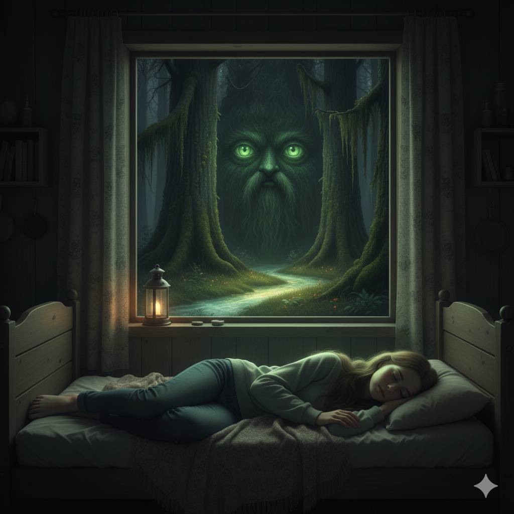 Ночь накрыла деревню липким воздухом. Мила ворочалась, считала тени на потолке. Заснула – и сразу увидела сон. Лес словно подошёл вплотную к дому. Стволы казались столбами моста, мхи свисали длинными бородами. Лес дышал – вдох пахнул дождём, выдох – холодом и прелыми листьями. Где-то в глубине среди деревьев светилось зелёным, как лампа под абажуром. Миле казалось, будто сама земля под ногами пружинит, как барабанная кожа, от каждого её шага.