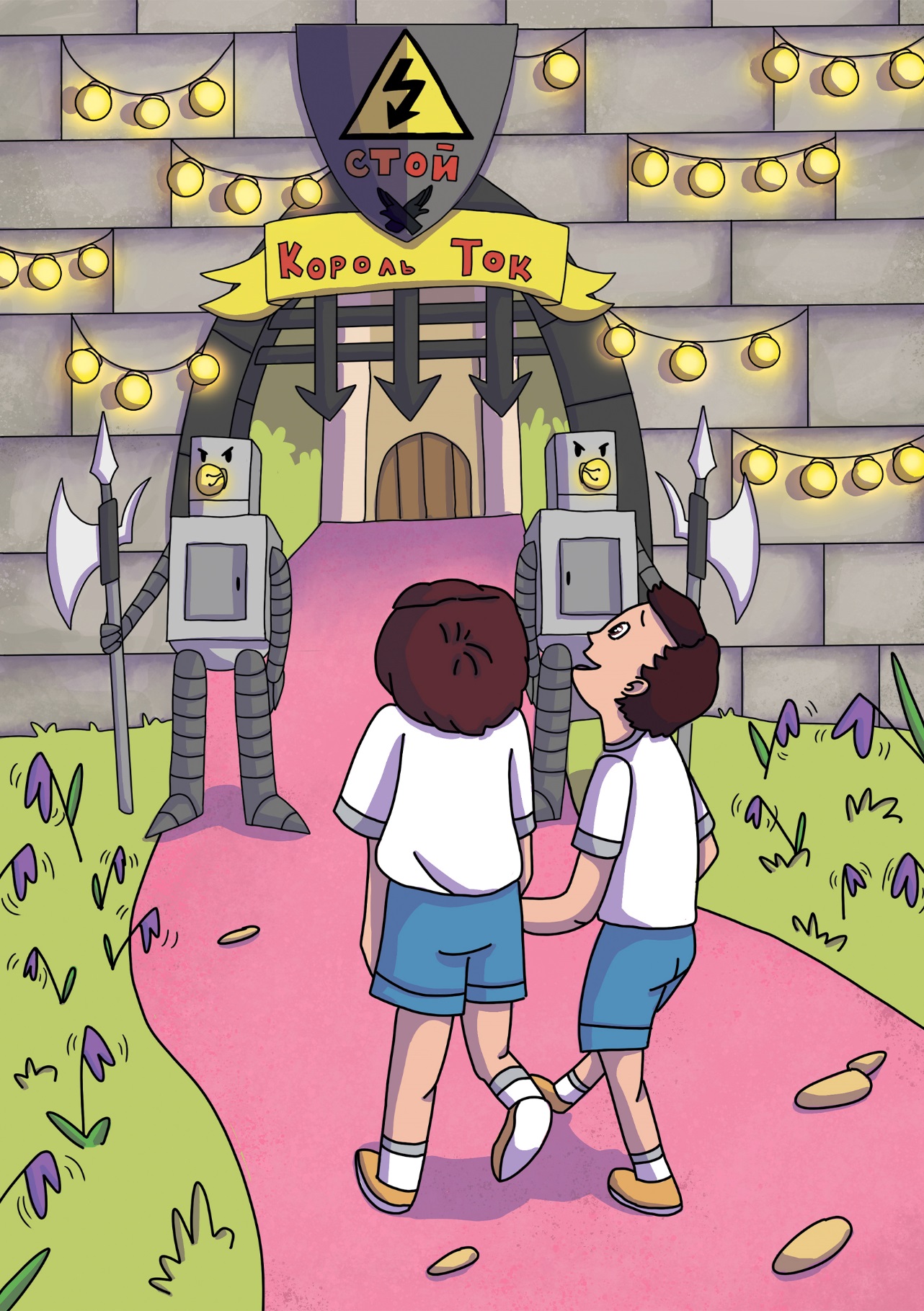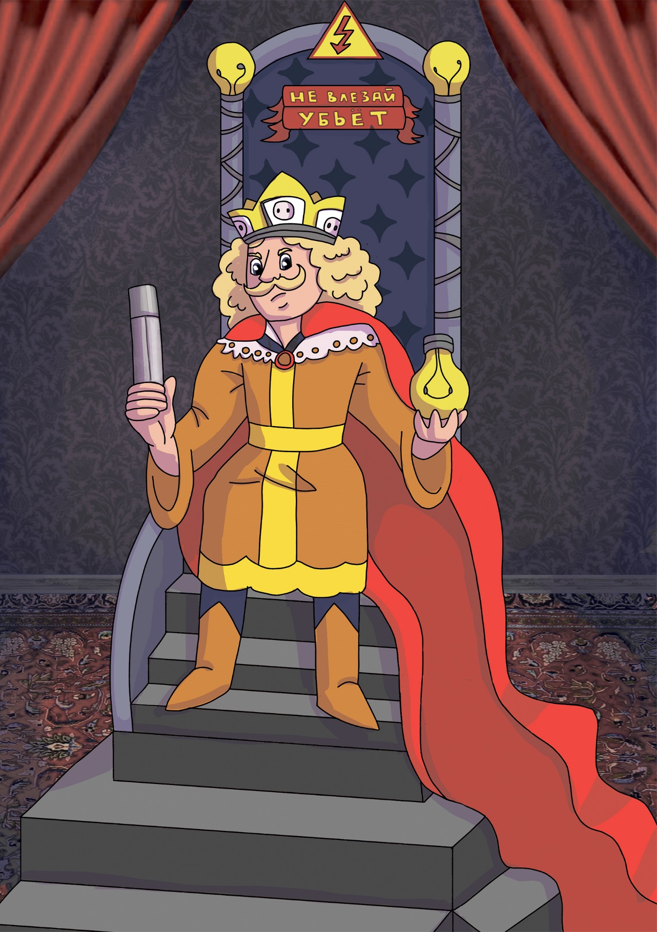Зал был полон придворных, а напротив входа, на другом конце зала, стояло два трона. На одном, что побольше, сидел сам король Ток. В одной руке он держал сверкавшую хрусталём электрическую лампочку, а в другой – сделанный из серебра и драгоценных камней предохранитель. На голове у него была надета корона, очень похожая на обыкновенную электрическую розетку. Рядом, на троне чуть поменьше, сидела его мать, королева Напряжение.