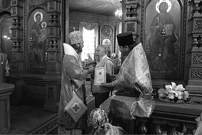 Епископ Гатчинский и Лужский Митрофан, В.П. Филимонов, протоиерей Георгий Преображенский. Вручение ордена митрополита Макария Московского и грамоты. 21 июля 2016 года.