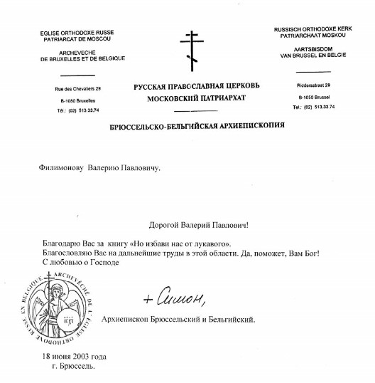 Письмо с благословением архиепископа Брюссельского и Бельгийского Симона на труды в области публицистики