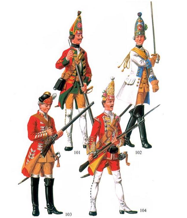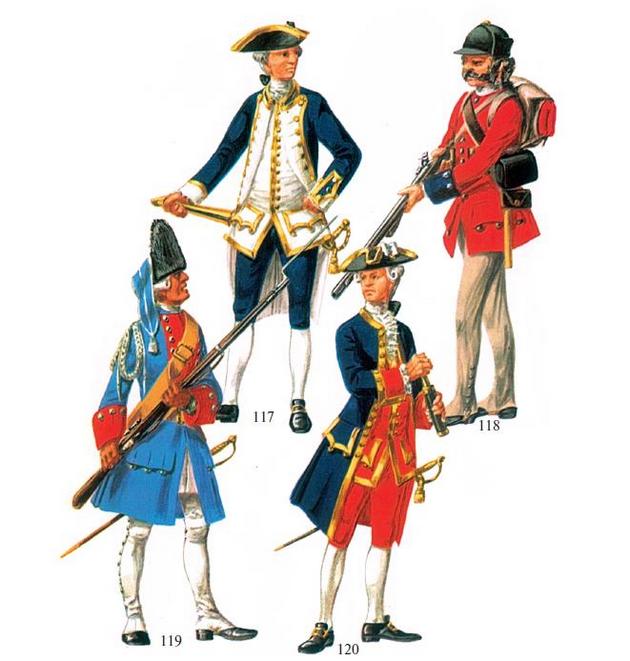 Вооруженные силы в североамериканских колониях обычно состояли из регулярных войск разных стран, здесь представленных. В Индии же воинские части формировались торговыми компаниями обычно из местного персонала. Одеты эти солдаты были большей частью как войска «материнской» страны, но к униформе добавлялись некоторые отличительные детали. Данный полк французской торговой компании был облачен в светло-синюю с красным униформу – очень похоже на королевские цвета. Носить длинные волосы и медвежьи шапки под палящим индийским солнцем, должно быть, было сущее мучение.