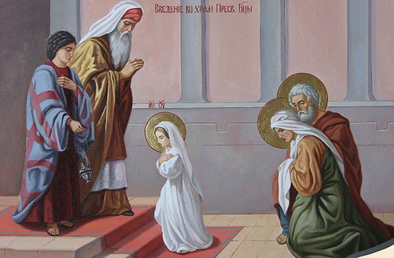 Когда исполнилось Деве Марии три года от рождения, родители Ее устроили торжественное введение Ее во храм Господень; в сопровождении свещеносных дев Она была встречена первосвященником Захарией и введена для поклонения Богу во святая святых, куда архиерей один мог входить только однажды в год. Как всякое пророчество не было произносимо по воле человеческой (Пет. 1, 21), так и этот необыкновенный поступок пророка Захарии мог быть совершен не иначе, как по особенному определению Божиему; потому и ангелы удивились, как воспевает Церковь, когда увидели, яко Дева входит во святая святых.