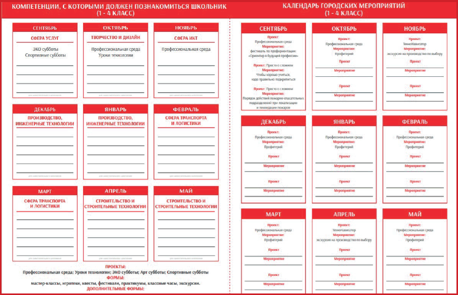 Возрастная группа – 1–4-й классыДля этой возрастной группы мы не выделяли компетенции, так как ребятам самое главное в этом возрасте – познакомиться со сферами труда и начать ориентироваться в профессиях, навыках специалистов и атрибутах труда. Используя календарь, классный руководитель может совместно с родителями и школьниками спроектировать интересующие мероприятия по профориентации и, исходя из рекомендаций, самостоятельно вписать события, которые посетил класс (рис. 12).