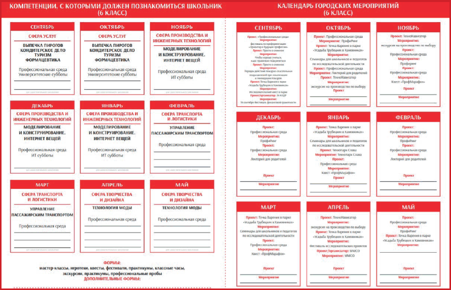 В правой части календаря для каждой возрастной категории указаны общегородские события и проекты, которые рекомендуется посетить. Среди них вы увидите: мероприятия проекта «Профессиональная среда», проект «Просто о сложном», фестиваль «Финансовой грамотности», экскурсии на производство, ТехноНавигатор, «Точка варения» в парке «Усадьба Трубецких в Хамовниках», мероприятия Технопарков, ММСО и другие.