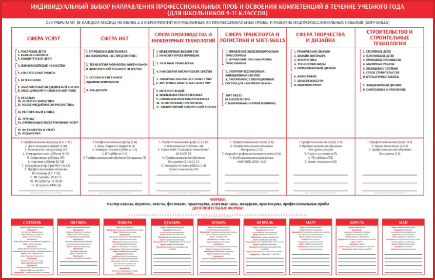 Для 9–11-х классов календарь объединён, в каждом месяце ребята посещают 2–3 мероприятия на выбор, подбирая наиболее интересную комбинацию компетенций, в которые хотели бы усиленно погрузиться. В каждой из сфер есть подборка из сета компетенций: например, поварское дело, выпечка, кондитерское дело входят в одну подгруппу, а фотография, звукорежиссура, видеооператор – в другую, такие сеты позволяют погрузиться в направление и совершить профессиональный выбор. А также в этой возрастной категории особенно уделяют внимание развитию софт скиллс, востребованных в выбранных профессиональных областях (рис. 13).