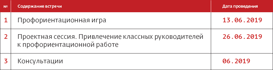4. Этап «Планирование, организация и проведение цикла мероприятий». Этап предполагает проведение профориентационных мероприятий с консультационным и экспертным сопровождением со стороны проекта «Профсреда». В его рамках происходит последовательная проработка с классными руководителями использования внешних ресурсов и инструментов индивидуализации в профориентационной работе.